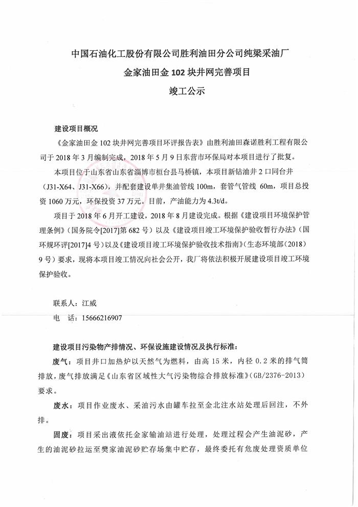 中國石油化工股份有限公司勝利油田分公司純梁采油廠金家油田金102塊井網(wǎng)完善項目竣工公示
