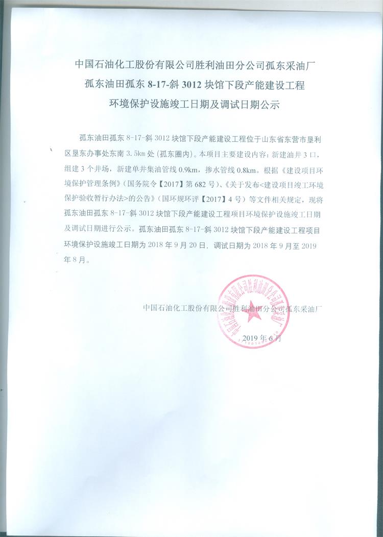 中國石油化工股份有限公司勝利油田分公司孤東采油廠孤東油田孤東8-17斜3012塊館下段產能建設工程環(huán)境保護設施竣工日期及調試日期公示