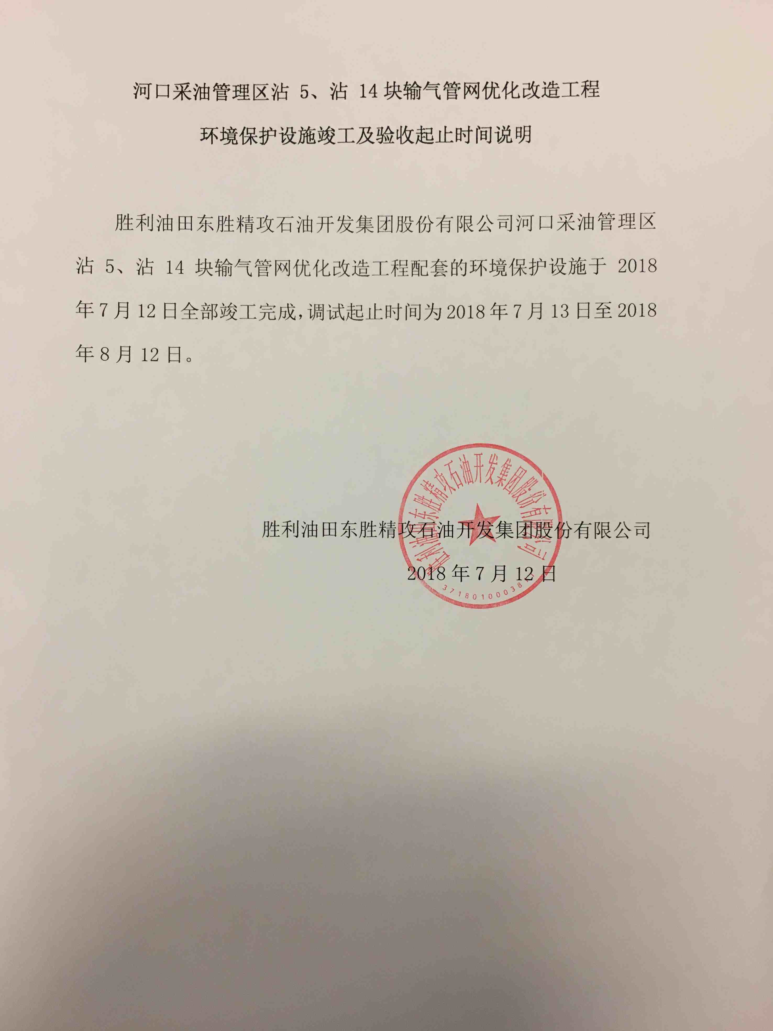 河口采油管理區(qū)沾5、沾14塊輸氣管網(wǎng)優(yōu)化改造工程環(huán)境保護(hù)設(shè)施竣工及驗(yàn)收起止時(shí)間說明