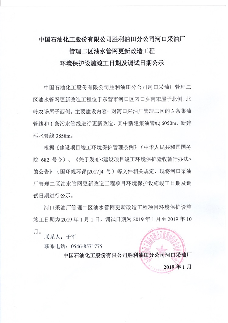 中國石油化工股份有限公司勝利油田分公司河口采油廠管理二區(qū)油水管網(wǎng)更新改造工程環(huán)境保護設施竣工日期及調試日期公示
